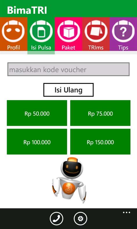 Aplikasi pertama di Indonesia yang bisa menampilkan info seputar profil Tri kamu dan memberi rekomendasi paket yang sesuai kebutuhan. Isi ulang jadi mudah karena bisa langsung dari gadget. BIMA juga bisa ngingetin waktunya isi ulang kuota.